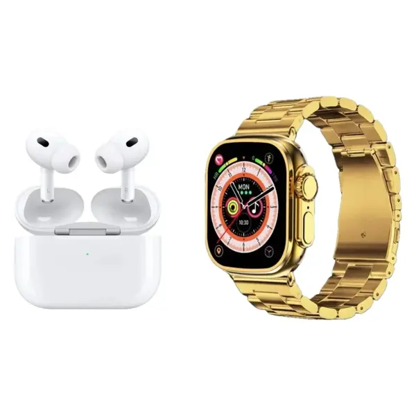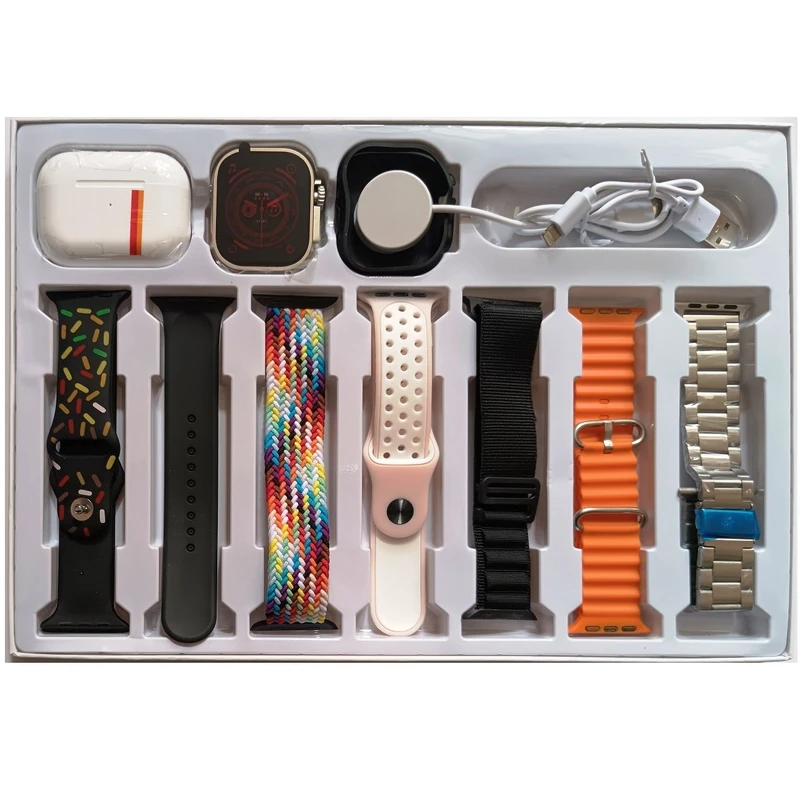 علاوه بر ساعت و بندها، یک عدد هندزفری بلوتوثی (طرح AirPods Pro) نیز در این بسته وجود دارد که ست گجتهای شما را تکمیل میکند. این هندزفری به صورت خودکار با گوشی شما جفت شده و کیفیت صدای مطلوبی برای موسیقی و مکالمه دارد.