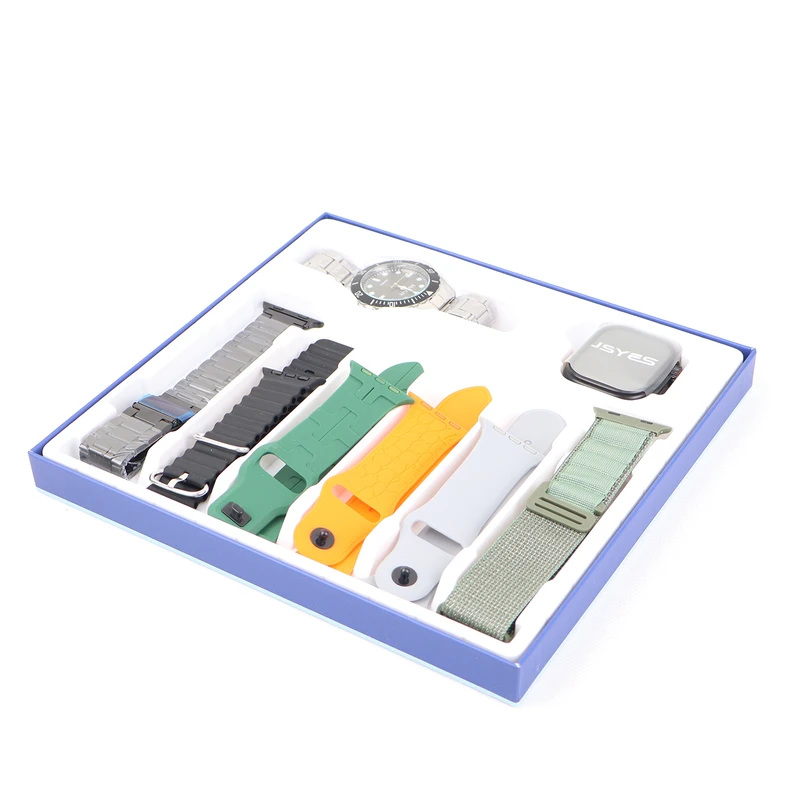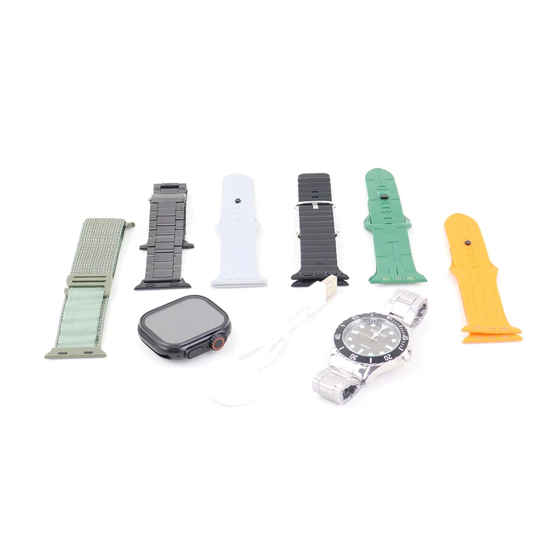 این محصول به صورت یک پکیج جامع عرضه میشود. با داشتن 6+1 بند لوکس و شیک (شامل بند فلزی استیل)، شما میتوانید ساعت خود را برای هر موقعیت رسمی، ورزشی یا روزمره آماده کنید. یک هدیه رایگان نیز در این پکیج وجود دارد تا ارزش خرید شما را دوچندان کند.